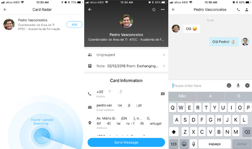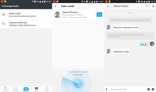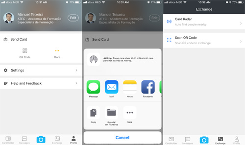 - Trocar cartões de forma simples, através de QR Code ou através da internet (por localização).