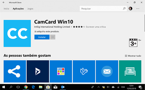 Assim a CamCard Free é uma App de gestão de cartões-de-visita líder no mercado, da empresa IntSig Information (empresa criadora do CamScanner), cujo número de utilizadores é já superior a 100.000.000. Também o número de downloads para a plataforma Android é superior a 10 milhões e número de reviews ronda os 100.000 com a classificação de 4,4/5 estrelas (resultado a 12/02/2018). Todavia para a plataforma IOS, não se consegue visualizar o número de downloads, mas encontra-se na AppStore com uma classificação de 4,5/5 com base em 245 reviews.