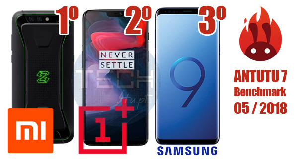 Em primeiro lugar temos o Xiaomi Mi Black Shark, seguido do OnePlus 6 (lançado esse mês, com fortes possibilidades de subir este mês de Junho, com atualizações do Sistema Operativo), seguido do Samsung Galaxy S9+.